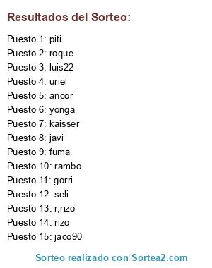 Lista de participantes: gorri, ancor, uriel, jaco90, r,rizo, yonga, seli, rizo, javi, fuma, roque, luis22, rambo, kaisser, piti.