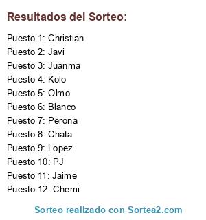 Lista de participantes: Olmo, Kolo, Christian, Chata, Javi, Lopez, Blanco, Jaime, Perona, Juanma, PJ, Chemi.