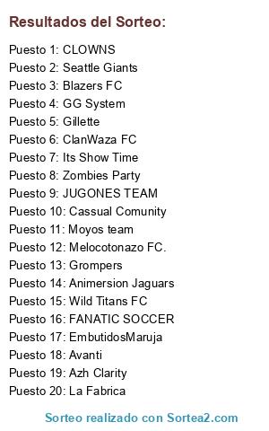 Lista de participantes: Zombies Party, GG System, ClanWaza FC, Blazers FC, FANATIC SOCCER, CLOWNS, Moyos team, JUGONES TEAM, Seattle Giants, Azh Clarity, Melocotonazo FC., Animersion Jaguars, Wild Titans FC, Cassual Comunity, Avanti, EmbutidosMaruja, La Fabrica, Gillette, Its Show Time, Grompers.