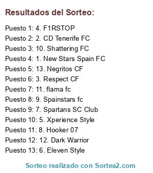 Lista de participantes: 1. Tres Sesenta FC, 2. Phoenix Squad, 3. WinnersTeam, 4. Pura Raza FC, 5. Shadow Gathered, 6. Eleven Wizards, 7. Athletic United, 8. Galacticos CF, 9. xQuality StarS, 10. T FUNDO FC, 11. Damn Ball FC, 12. Los Cuchillitos, 13. ILLUMINATI FC, 14. Rapids Souls, 15. Valhalla CF, 16. Ferrol.