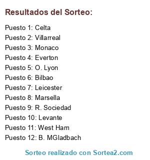 Lista de participantes: Leicester, West Ham, Everton, B. MGladbach, Marsella, O. Lyon, Monaco, R. Sociedad, Villarreal, Bilbao, Celta, Levante.
