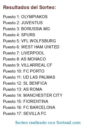 Lista de participantes: AS MONACO, AS ROMA, BORUSSIA MG, FC BARCELONA, FC PORTO, FIORENTINA, JUVENTUS, LIVERPOOL, MANCHESTER CITY, OLYMPIAKOS, SEVILLA FC, SL BENFICA, SPURS, UD LAS PALMAS, VFL WOLFSBURG, VILLARREAL CF, WEST HAM UNITED.