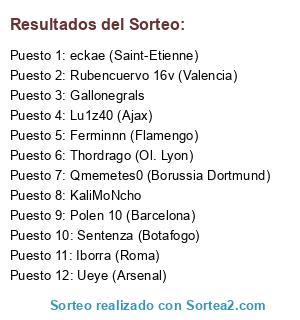 Lista de participantes: eckae (Saint-Etienne), Sentenza (Botafogo), Thordrago (Ol. Lyon), Ferminnn (Flamengo), Gallonegrals, Iborra (Roma), Rubencuervo 16v (Valencia), Lu1z40 (Ajax), Qmemetes0 (Borussia Dortmund), Polen 10 (Barcelona), Ueye (Arsenal), KaliMoNcho.