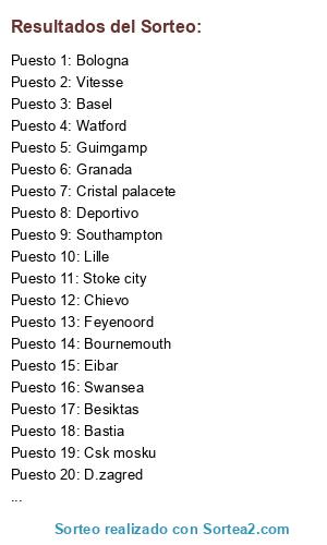 Lista de participantes: West bromwich, Watford, Swansea, Sunderland, Stoke city, Southampton, Hull city, Cristal palace, Bournemouth, Bastia, Bordeaux, Guimgamp, Lille, Lorient, Montpellier, Nantes, Nice, Rennais, Saint etienne, Toulouse, Atalanta, Bologna, Chievo, Génova, Sassuolo, Torino, Udinese, Sampdoria, Empoli, R.sociedad, Betis, Málaga, Granada, Español, Eibar, Deportivo, Celta, Ajax, Feyenoord, Utrecht, Vitesse, D.zagred, Csk mosku, Basel, Besiktas, D.kiev, S.braga, S.portugal.