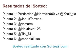 Lista de participantes: Perderdor @Norman000 vs @Krait_tiark, @candelaluisa, @verratta, @Tin_74, @Nextlevel123, @JesusTorress.