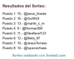 Lista de participantes: 9.- @Norman000, 10.- @JesusTorress, 11.- @Nextlevel123, 12.- @Betis_87, 13.- @martin_c_m, 14.- @luysvoorhees, 15.- @jesus_linares, 16.- @GoNHiX.