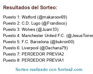 Lista de participantes: C.D. Lugo (@Frandisco), F.C. Barcelona (@bukron00), Liverpool (@Dachana79), Manchester United F.C. (@JesusTorress), Wolves (@Juanr33), Watford (@makaroov69), PERDEDOR PREVIA1, PERDEDOR PREVIA2.