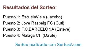 Lista de participantes: F.C.BARCELONA (Esteve), EscuelaVieja (Jacobo), Málaga CF (Davile), Jove Raspeig FC (Guti).