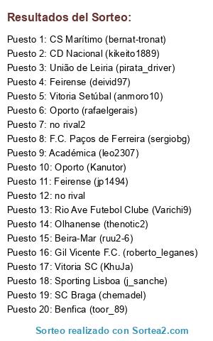 Lista de participantes: Benfica (toor_89), Oporto (Kanutor), Sporting Lisboa (j_sanche), Académica (leo2307), Beira-Mar (ruu2-6), SC Braga (chemadel), Feirense (jp1494), Gil Vicente F.C. (roberto_leganes), CS Marítimo (bernat-tronat), CD Nacional (kikeito1889), Olhanense (thenotic2), F.C. Paços de Ferreira (sergiobg), Rio Ave Futebol Clube (Varichi9), União de Leiria (pirata_driver), Vitoria SC (KhuJa), Vitoria Setúbal (anmoro10), Oporto (rafaelgerais), Feirense (deivid97), no rival, no rival2.