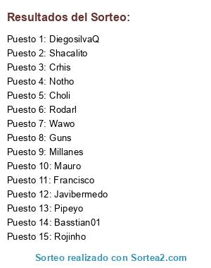 Lista de participantes: Crhis, Millanes, Pipeyo, DiegosilvaQ, Guns, Basstian01, Rojinho, Choli, Rodarl, Mauro, Wawo, Notho, Javibermedo, Shacalito, Francisco.