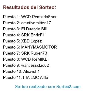 Lista de participantes: WCD PensadoSport, WCD IceMIKE, AlexvsF1, FIA LMC Alflo, SRK EnricF1, wantlessclud82, emotivemitten17, XBD Lopez, El Duende Bill, SRK Ruben73, MANYMASMOTOR.