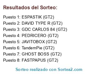 Lista de participantes: GDC CARLOS 84 (GT2), GHOST BOSS (GT2), JAVITOBOX (GT2), ESPASTIK (GT2), PEDRICERO (GT2), FASTPAPUS (GT2), DAVID TYPE R (GT2), TandemPie (GT2).