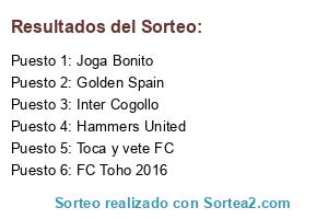 Lista de participantes: Golden Spain, Joga Bonito, Toca y vete FC, Inter Cogollo, FC Toho 2016, Hammers United.