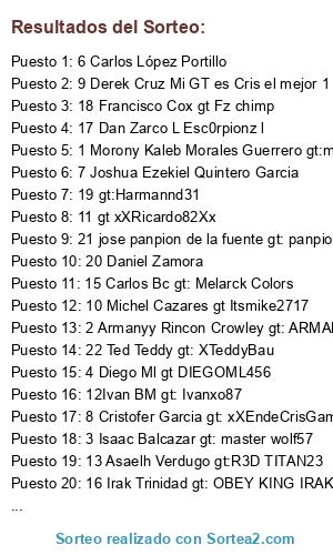 Lista de participantes: 1 Morony Kaleb Morales Guerrero gt:morony2205, 2 Armanyy Rincon Crowley gt: ARMANYYCROWLEY, 3 Isaac Balcazar gt: master wolf57, 4 Diego Ml gt DIEGOML456, 5 Leonardo Escamilla gt: XXXxXNaiiOxxXXX, 6 Carlos López Portillo, 7 Joshua Ezekiel Quintero Garcia, 8 Cristofer Garcia gt: xXEndeCrisGamer, 9 Derek Cruz Mi GT es Cris el mejor 1, 10 Michel Cazares gt Itsmike2717, 11 gt xXRicardo82Xx, 12Ivan BM gt: Ivanxo87, 13 Asaelh Verdugo gt:R3D TITAN23, 14 Javier Abdiel GT: javiercito 77, 15 Carlos Bc gt: Melarck Colors, 16 Irak Trinidad gt: OBEY KING IRAK., 17 Dan Zarco L Esc0rpionz l, 18 Francisco Cox gt Fz chimp, 19 gt:Harmannd31, 20 Daniel Zamora, 21 jose panpion de la fuente gt: panpion13, 22 Ted Teddy gt: XTeddyBau, 23 Kevin Gael banda rosa gt: Electchalice50.