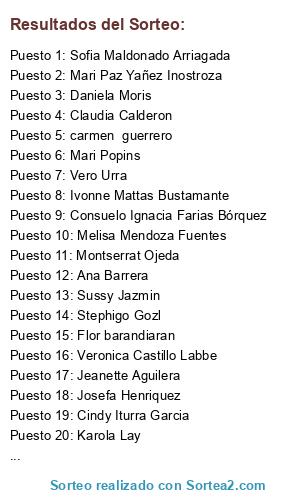 Lista de participantes: Mari Paz Yañez Inostroza, Cristopher Galvez, Catalina Sep, Ana Barrera, Vicente GR, Camila Javiera rubio Ch, Karola Lay, Montserrat Bruñol, Josefa Henriquez, Consuelo Ignacia Farias Bórquez, Sofia Maldonado Arriagada, Cindy Iturra Garcia, valeria Balbontin Campomanes, Stephigo Gozl, Vero Urra, Karencita P, Mellado, Veronica Olivia Carrasco Alvares, Jaqueline Cabrera la Rosa, Kasandra Nayibe Deb Valenzuela, Nicolás Jofré Ormeño, Camila Calvin, Claudia Calderon, Daniela Moris, Mari Popins, Sussy Jazmin, Melisa Mendoza Fuentes, Veronica Castillo Labbe, Ivonne Mattas Bustamante, Jeanette Aguilera, Monica tobar Moya, Rose Mary Iturrieta Oyarzun, Montserrat Ojeda, Mary fran, Patricia Bozo, Flor barandiaran (2), María Luisa Gutiérrez, carmen guerrero.