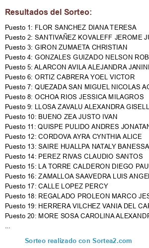 Lista de participantes: ACUÑA ALCARRAZ AARON, ADRIANZEN VALENZUELA MELINA ELIZABETH, ALARCON AVILA ALEJANDRA JANINE, ALVA VILLA JAMES ALEXANDER, ALVARADO LLATANCE DANY, ALVARADO REVILLA SAMUEL RODOLFO, ALVAREZ MURO BRUNA LIZ ARIANA, ALVAREZ QUIÑONEZ EDUARDO, ALVAREZ VENTOCILLA YEVIT AMPARO, AMAUT PRUDENCIO KENYI GUILLERMO, ANDRADE HUAMAN YAMINA, APARICIO AMPUERO IVAN MARCELO, APAZA HUARICACHA NELSON JOSE, ARAKAKI SETO JORGE ALEJANDRO, ARCELA RETAMOZO HUGO ROLANDO, ARELLANO HERRERA FRANK LORENZO, AREVALO CALDERON KARLA MIRIAN, ARIAS FERNANDEZ FRANCK JHEFERSON, ARROYO MENDOZA EDER VICTOR, ASPAJO ARIAS JOSE ALBERTO, ATANACIO BRAVO JHONNATAN YAMIR, BENITO ORELLANA ALDO ENRIQUE, BRAVO ROJAS ANGEL, BRAVO ROJAS NICOLAS, BRITO MONTES JOSE HUMBERTO, BUENO ZEA JUSTO IVAN, CABALLERO HUIMAN ESTEFANY ALEXANDRA, CABRERA MONTES LUZ DEL CARMEN, CACHA SILUPU PATRICIA GIOVANA, CALDERON BARTRA JOSE LUIS FRANCO, CALDERON MARTINEZ RENATO MANUEL, CALLE LOPEZ PERCY, CAMPOS AVILA JOSE ALBERTO, CARDENAS ZEGARRA ALEX ARMANDO, CARMONA YATACO DEBORA CECILIA, CARNERO AGUERO XIMENA, CARVALLO CASTRO GABRIELLE ANDREA, CASAS LIZA ROGELIO, CASAS MALLMA ROSARIO JUDITH, CASTAÑEDA CHAVEZ JHAN RENZO, CASTRO CORDOVA JESSICA MARGARITA, CCASA HUAMAN LUZ MARINA, CCAYPANI VASQUEZ JHON MARIO, CHEE CUCALON CHRISTIAN, CHIRINOS CEPEDA KARINA NATALIA, CHUQUISPUMA MAGALLANES JHEYSON DANIEL, CONCHA YANGUA JHERSON DANNEL, CONDEÑA NAVENTA RUS MERY, CORBERA TERRONES WILSON JAZIER, CORDOVA AYRA CYNTHIA ALICE, CRUZ ESPINOZA JORGE LUIS, CURO DIAZ ALEX FERNANDO BILLY, DAMIAN CARPIO DIEGO ENRIQUE, DE LA CRUZ CARRASCO LUIGI DANIEL, DELGADO TECSI ARTURO, DEXTRE MORI KORI CAROLINA, DIAZ LAZO ALEXANDRA FIORELLA, DIAZ QUILCATE REGINA, DURAND SINCHE OSCAR, ECHEGARAY ORTIZ DE ORUE JERSON JESU, ESCOBAR ARIAS JOHNNY SANTIAGO, ESPINOZA MEJIA JORGE DAVID, ESPINOZA MORALES VICTOR HUGO, ESPINOZA VARGAS FELIPE ALEJANDRO, FALCON PARRA JOSEPH CARLOS, FERNANDEZ ONTANEDA OSCAR ERNESTO, FERNANDEZ RODRIGUEZ JHONATAN DAVID, FIGUEROA SERRANO NOE DANIEL, FLOR SANCHEZ DIANA TERESA, FLORES ESPINOZA CAROL SOFIA JEANETTE, GADEA EYZAGUIRRE MAGALI MARIELA, GALINDO BRAVO FIORELA JOSELIN, GALVEZ SANCHEZ JOSE AUGUSTO, GAMARRA VILLANUEVA CONNIE LIA, GARCIA MEZA RICKY, GIRON ZUMAETA CHRISTIAN, GOMEZ ICO ERICK ALBERTO, GOMEZ ICO JUAN MANUEL, GONZALES FALCON GIANPIERE ALEJANDRO, GONZALES GALLEGOS ABEL MARCOS, GONZALES GUIZADO NELSON ROBERTO, GUEVARA VIVANCO ALEJANDRO RAY, HERRERA VILCHEZ VANIA DEL CARMEN, HILARIO CALIXTO RONALD ROBERTO, HUAMAN CAVIEDES HEIDY LISETH, HUAMAN POMA JAVIER, HUERTA CHANG JOSE DAVID, HUINGO LLICO LUIS ALBERTO, HURTADO RAYME ANTHONY STALIN, ICHPAS GOMEZ NERIDA, ITURRIA TORRES CESAR ANDRES, JAIMES DE LA CRUZ OVER EDU, JUAREZ VILCHEZ JOSE NEMESIO, JULCA CALDERON ANGEL JAVIER, LA TORRE CALDERON DIEGO PAUL, LASTRA QUISPE LENNIN JEANFRANCO, LIMAYLLA RODRIGUEZ WENDY ZORAIDA, LINARES GARCIA CYNTHIA LORENA, LINGAN SOLANO GLORIA ISABEL, LIVIA HUAYANE NATHALIE DAPHNE, LLOSA ZAVALU ALEXANDRA GISELLA, LOPEZ CARLOS GABRIELA SCARLET, LOPEZ CORDOVA RONNY, LOPEZ FLORES EMMELINE, LOPEZ NICOLINI CESAR AUGUSTO, LOSSIO GONZALEZ DEL VALLE FIORELLA, LUSTRE PERALTA TERRY WILLIAMS, MACHADO ZAPATA DORAGILDA LILIANA, MACUTELA CHAMPI LILIANA, MAMANI CHERRES RENZO AUGUSTO, MAMANI DELGADO CHRISTIAN ALEX, MAMANI HERRERA LUIS JESUS REYNALDO, MANAYAY CESPEDES MARCELINA, MANSILLA URPI RUDY FRANCISCO, MARIN HUAMAN JHEFREY CESAR, MAURICIO ROMERO JONNATAN EDWAR, MAYO CARLOS RENZO HASSAN, MEDINA NAKAMINE FRANKLIN DAVID, MEJIA GARCIA DAVID JESUS, MELLADO PALOMINO DIANA CAROLINA, MOLINA PANIAGUA WILFREDO RUBEN, MONTAÑEZ BACA PAUL JUNIOR, MONTES MACHACA JHONATAN, MORE SOSA CAROLINA ALEXANDRA, MORENO GRANDA DIANA ANDREA, MORI VALENZUELA SAUL ENRIQUE, MOTTA TAMARA JUDITH ROXANA, MUJICA CALDERON CARLA TATIANA, MUÑOZ LOPEZ MILAGROS JANETH, NORIEGA MOLINA MIGUEL ANGEL, NUÑEZ PACHECO ANGEL JESUS, NUÑEZ PARRA KAROL JHUSEP, ÑAHUE VELASQUEZ ABEL EFRAIN, OCHOA RIOS JESSICA MILAGROS, ORDINOLA CELIS JUNIOR EDUARDO, ORIHUELA NORIEGA GABY MARIETTE, ORTIZ CABRERA YOEL VICTOR, OSCCO QUINCHO VICTOR DANIEL, PACHAS MATIAS MARCO JESUS, PACHECO CONDOR CLARA ANTONIA, PACO HUANACUNI JAVIER ANTONIO, PAREDES LUNA LYNDA, PAREDES MONTAÑO MANUEL ANDRES, PAREDES RIVERA JUAN MANUEL, PEÑA CHALCO RICHARD ANDERSSON, PEREZ RIVAS CLAUDIO SANTOS, PERICHE RAMOS JAVIER ARTURO, PORTOLATINO PUCHURI DIEGO ALONSO, PREBEKE HUIMAN RONALD JESUS, PRINCIPE TAPAY RUBEN HELMER, QUEZADA SAN MIGUEL NICOLAS AGUSTIN, QUINTANA PIZARRO YESENIA MERCEDES, QUINTO FLORES TERRY EL ASSIR, QUIÑONES MORALES MARICARMEN NASLA, QUISPE CALSIN EFRAIN ISAIAS, QUISPE ILLIUYA KATHERIN VIVIANA, QUISPE MILLA CINTHYA GIANNINA, QUISPE PULIDO ANDRES JONATAN, RAMIREZ GARCIA NANCY JANET, RAMIREZ SANCHEZ GUSTAVO VITTORIO, REGALADO PROLEON MARCO JESUS, REMON GAMBOA JOHN JOEL, REVOREDO IZQUIERDO JUAN KEITH, REYES PALOMINO VICTOR MANUEL, RINCON LEON JUAN MANUEL, RODRIGUEZ ALA BILLY EDUARDO, ROHRSTOCK X ARIEH, ROJAS HANCCO CLIVER ALEXANDER, ROJAS PAITANMALA JEFFERSON ERICK, ROSALES ROJAS ESTEBAN, RUIZ SILVA ELENA, SAAVEDRA ZEVALLOS ERIKA DEL CARMEN, SAIRE HUALLPA NATALY BANESSA, SALAMANCA VELASQUEZ MARIO, SALAS FLOREZ GABRIEL, SALAZAR MURGUIA JOHAN GIANCARLO, SALCEDO JANAMPA JAIR ANTONIO, SALDARRIAGA CASTILLO DAVID ALEJANDRO, SALOME AVILA CRISTIAN MARTIN, SALVADOR MERINO KELVIN, SANCHEZ BRIONES ELIZABETH JEMIME, SANCHEZ LLERENA BRAULIO, SANCHEZ MARIN ALBERTH, SANCHEZ YATACO JHEIMY GUILLERMO, SANDOVAL BALDERA JOSE LUIS, SANTA MARIA NORABUENA ALBERTO RAFAEL, SANTAYANA VELA ROSENDO RUFINO, SANTIVAÑEZ KOVALEFF JEROME JUNIOR, SARMIENTO MELGAREJO CARLOS ALEJANDRO, SCOTT CASTAÑON LORRAINE CECILIA, SIERRA GUTIERREZ JUAN IGNACIO, SILVA YEN EDGARD MAXIMO, SOLIS TORRES JOSE LUIS, SOTO BAUTISTA VLADIMIR, STOLL GARCIA ALVARO SEBASTIAN HUMBERTO, SUASNABAR LEZAMA JIM LEO, TAPAHUASCO AVILA JOSUE FLAVIO, TAPIA PARRA MIGUEL ANGEL, TARDEO ESCOBAR JULIO MIGUEL, TELLO GARCIA ENITH, TICSE MENDOZA FIORELA LIZ, TORIBIO CHAVEZ JULIO CESAR, TORRES CAMPOS ERMAN, UBILLUS RODRIGUEZ TULIO B
