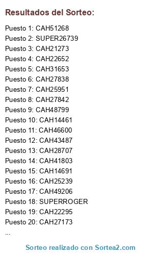 Lista de participantes: CAH42953 1, CAH28707 1, CAH27173 1, CAH25951 1, CAH46600 1, CAH42841 1, CAH14691 1, CAH21273 1, CAH51261 1, CAH27838 1, CAH31653 1, CAH25951 2, CAH13149 1, CAH51268 1, CAH43487 1, CAH22295 1, CAH14461 1, CAH27838 2, CAH27838 3, CAH25951 3, CAH23443 1, CAH17297 1, CAH14461 2, CAH22652 1, CAH51268 2, CAH41803 1, CAH39758 1, CAH31653 2, CAH51268 3, CAH48799 1, CAH42841 2, CAH31653 3, CAH49206 1, CAH49206 2, CAH41803 2, CAH46600 2, CAH25951 4, CAH14691 2, CAH42841 3, CAH51261 2, CAH51261 3, CAH14461 3, CAH14461 4, CAH42841 4, CAH31653 4, CAH49206 3, CAH25951 5, CAH51261 4, CAH51261 5, CAH46600 3, CAH46600 4, CAH27838 4, CAH49206 4, CAH49206 5, CAH18637 1, CAH14461 5, CAH23443 2, CAH10426 1, CAH28707 2, CAH41803 3, CAH25951 6, CAH49206 6, CAH51268 4, CAH51261 6, CAH37346 1, CAH43809 1, CAH25951 7, CAH49206 7, CAH42953 2, CAH42686 1, CAH13149 2, CAH25951 8, CAH10426 2, CAH17297 2, CAH46600 5, CAH27842 1, CAH48799 2, CAH25239 1, CAH25951 9, CAH42686 2, CAH42953 3, CAH25951 10, CAH25951 11, CAH51261 7, CAH48799 3, CAH25951 12, CAH15453 1, CAH22652 2, CAH46600 6, CAH22652 3, CAH49206 8, CAH25951 13, CAH25951 14, CAH25951 15, CAH51261 8, CAH17297 3, CAH46600 7, CAH25951 16, CAH14691 3, CAH23443 3, CAH25951 17, CAH46600 8, CAH49206 9, CAH15453 2, CAH51268 5, CAH22295 2, CAH22295 3, CAH43487 2, JEFE3105 (4 participaciones), SUPER26739 (4 participaciones), SUPERROGER (3 participaciones), SUPERROGER.