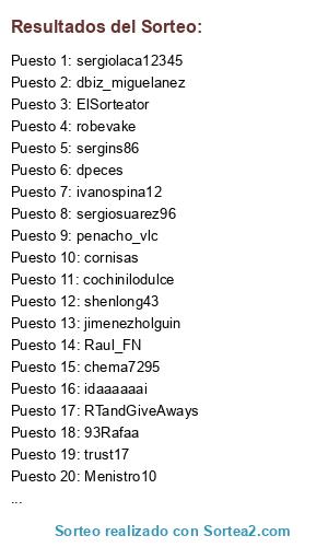 Lista de participantes: chema7295, trust17, RTandGiveAways, sergins86, Menistro10, idaaaaaai, 93Rafaa, robevake, dpeces, dbiz_miguelanez, cornisas, jimenezholguin, ElSorteator, sergiosuarez96, Raul_FN, sergiolaca12345, penacho_vlc, ivanospina12, cochinilodulce, shenlong43, acarplay19.