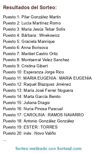 Lista de participantes: Nerea González Cortina, Mabel Bonora Sanchez, Yolanda Yuste Espada, Susana Lucas Manzanares, Amelia Esther García Crespo, Lorenzo Segura Zapata, Rosa Ruiz, Ana Abad, Maria Jose Intxausti, María José Ferrer Noguera, Nuria Pinosa Pascual, Reyes Gutiérrez, Maria Raso Rodriguez, Maria José Villalobos, Antonia Reyes, Angels Subira garrido, Visan Mircea Doru, Juan Tejero Gómez, Antonio José González González, Mª Angeles Noe Carrascosa, Maria Isabel Vicente Ramos, María Ángeles Medina, Sandy Erb, Olga Sañudo Serra, Carmen Rámila Valladolid, Lola Cortés Carretero, Luis Ángel Gónzalez Maceiras, José Antonio Pena Patricio, María Isor Marín Mejía, Carmen Martin Cortes, HAYLEY KEEHAN, Isabel López, Graciela Manrique, Isabel Blanco Galera, Gabriela Ursul, Rosario Fernández Fernández, JUAN Alarcón Rubio, Francisco Javier Hernández López, Lolr Ríos Picazo, Juan Gutiérrez Romayor, Lidón Sidro Cañas, Jaime Alcocer Hernandez, Mª Macarena Gómez Casas, Mari Carmen Bennitez Laserna, Marta García Benito, Aurora Leal, Victoria Serrano Sánchez, Elena Otazu Rubio, María Consuelo Bedoya Hernández, Omar Quiñoa Rodríguez, Montserrat Flores Rodriguez, Maria Luisa Moreno Sampedro, Teresa Serra Salada, Maria Cristiana Paniagua, Mayte Márquez Masa, Svetlana Voronenko, María Isabel Romero Blanco, Esperanza Jorge Rico, Ramón Aracil Bernat, Ángela Beatriz Salas Conde, Ana María Manrique Mateos, Geidy Cuza Valle, Marta Ceballos Lodeiro, José Antonio Cinos Juanes, Pedro Romero Sanjuan, Cristina Romaguera Albert, Adriana Santos, ROSE Marie Ortiz Gallego, Jorge Rodríguez, Cristiana Delgado de Nova, Sonia Alonso, Carmen García Marton, Patricia Molina Peña, Sabino García Francos, Lynda Demangeat, Roberto Pérez Alonso, Merche Schwandt Navarro, Beatriz Raffo Mattos, Amparo Vites Miranda, Lourdes Naranja, Concepción López Ortuño, Altamira Valle Cantón, Maria Jose Boluda Ramirez de Arellano, Amparo Mora Santamaría, Teresa Parga López, Leonardo Loyaga, Herbert Hinkel, Julia Huete Carvajal, Manoli Caerols Benito, Maribel Illesca Yumani, Cristina Esteban Caballero, Inmaculada Casanova Rodríguez, Begoña Carrillo Gómez, Sonia Pérez Lanchazo, Rosa del Pilar Tamayo Otiniano, Esther Escribano Pelarda, Alicia Díaz Alonso, Esperanza Jimenez Llorente, Reyes Jover Sanz, Reina Acosta Pérez, Lucía Martínez Romo, M Carmen Pérez, Ayde Cárdenas Hurtado, Cecilia Aguas, Gloria Mercedes Benegas Caballero, Montserrat Gálvez Carrasco, Encarna García Romero, Joaquina Giménez Collado, Carlos Alsina Bonfill, Susanne Henze, M Carmen García Villar, Isabel Garcia de los dolores, Maria Jesús Galindo Bollain, David Llorente, Claudia Giampieri, Beatriz Macías Suárez, Esther García Caro Fernandez, Montserrat Velez Sanchez, Carmen Garcia Anton, Juan Carlos Contreras Acedos, Loli González Perea, Ester Ortega, José Hernández Sonseca Yepes, Aurora Calleja Toca, Fina Medina Lorenzo, M luisa Aguilar Aguilar, Encarna Ripoll Bruneti, María José Bolaños Pérez, Mariol Calvo Álvarez, Mariluz Pucón, Soledad Villar Fdez., Charo Garcia Gracia, Begoña Echaburu, Gioconda Jimenez, isa Izquierdo Pérez, Mercedes Perez Millan, Ruth Marin Garrido, Bárbara Wnekowicz, David Riaño Pallares, Pilar González Martín, inés Novo Valiño, Rita Moreno Medina, Esther Font Garriga, Noemi Saez Saez Perez, Ana Díaz, Lorena Muñiz, Ana Diez Méndez, ISABEL ABAD HERNANDEZ, Eva Cejudo Lopez, CARMEN GARCIA AGUADO, Esther Herrera Simo, Carmen Beltri Rosa, Iluminada Perez Cañizares, Israel Nieto Gomez, Maria Isabel Pont Coll de Carrera, Simona Stan, Sonia Suarez Morata, Antonio González González, Salut Roma, Juliana Dragoi, Marian Tarazona Marqueta, Rosarionumo Núñez Molina, Nuria Barreda Vendrell, Evdokiya Simeonova Filatova, Conchi García Gómez, Marcela Sica, Marta Chacón Ilundain, Elena Blasco Choclan, Joaquin Martínez, Rosa Mari Casillas Antona, Pilar López Ramasco, Elena María Roma Cotanda, Miguel Ángel Martínez Viejobueno, María Dolores Salas García, Nieves Pardos Royo, Claudiap Garzón M, Isabel Prieto Von Derschau, María Esther Mediavilla Vicente, Angel Martínez, Ana Llanos, Francisco Javier Josa Cotela, Araceli Sánchez MMartínez, Estefanía Fernández Fernández, María Isabel García Pérez, Mar Potes Valcarce, Lilian Maldonado Skiba, Melanie Rey González, Ion Luca, Patricia Rivera, Zuzana Minarovicova, Carmen Payá Ladehesa, Lola Ibañez, Elizabeth Orellana Balderrama, Jesús Pérez Sánchez, Fini Rodríguez Saez, Carmen Elisa Giraldo Chaves, Mª del Carmen Villegas, Consuelo Cerro Neira, Araceli González Lafont, Mirta Adriana Pereira Maldonado, Concepción Martínez, Antonio Hernández Regueiro, María Isabell Medina Manzano, TAnia Torremolinos, Amor Atance Vicente, Vivian García Rodríguez, María Emerita Pan Vázquez, María del Pilar Mateo González, Gloria Pastor Berenguer, M Lourdes Maroto Gil, Rita Cabrera Díaz, Adriana Montero Belloch, Rafael Sevillano Caballero, M Carmen Belmonte, Conchi Torres Castilla, Encarna Rubio Gómez, Rosario Pérez López, Mercedes Marín, Yousra Oukharraz Boumrah, Gemma Sanz López, Milagros Marlasca Pajares, ANTONIA DE DEUS SILVA, Mercedes Araujo Álvarez, Carlos Sanjuás Casanova, Isabel Rebolo Fernández, María Jesús Pérez Martínez, Jonathan Romero Jiménez, Remedios C.B., Carmen Martín Barrera, Maribel Castro Ortiz, Lourdes Ramirez Rivas, María Manuela Valdés Fanjul, M. ANGELES MARTIN CHAPINAL, Gemma Martin, CRISTINA ZURITA NEGRO, Lizzety Martinez, Silvia de la torre, MARCOS LOMBIDE MORAGUES, isabel Cebrián Martín, Juana Alarcon Simarro, Svetlana Nametkin Nametkina, Concepcion Valderrama luna, Cristina Rodríguez García, Juan Martín Muñoz, Ana Verónica Lazar, Anna Borisova, Carlos Eduardo Encinoso Reverón, Jose Carlos Paredes González, Arturo Álvarez Martín, María José Cobos Rosua, Adriana Motter Haas Penner, Pilar Rivas Polo, Rosa María Marcos Martínez, Katerin de la Cruz Navarro, YULIANA STOILOV