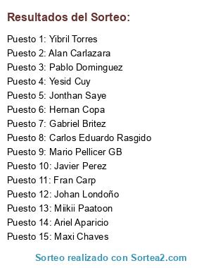 Lista de participantes: Alan Carlazara, Fran Carp, Maxi Chaves, Hernan Copa, Jonthan Saye, Carlos Eduardo Rasgido, Yesid Cuy, Gabriel Britez, Ariel Aparicio, Johan Londoño, Mario Pellicer GB, Pablo Dominguez, Miikii Paatoon, Javier Perez, Yibril Torres.