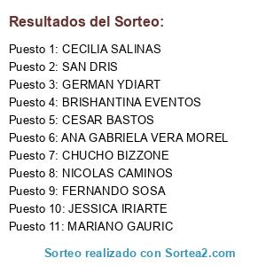 Lista de participantes: LUCAS SALAS, GAVITAH AGUIRRE GABRIELA, GABY BATERA, GILELA BILAVCHIK, CECILIA SALINAS, ROXANA GALIÑANES, CESAR GALEANO, JESSICA IRIARTE, JOSE LUIS CHIAVASSA, SAN DRIS, FERNANDO SOSA, NICOLAS CAMINOS, BRISHANTINA EVENTOS, CESAR BASTOS, ANTO VUK, NASH MALKV K, MARIANO GAURIC, CHUCHO BIZZONE, LOLI CAZENAVE, NATALIA NATI, GERMAN YDIART, ANA GABRIELA VERA MOREL, ANDREA VUK, MARIA JULIA MMIRAVAL, LILIANA ALMADA, CELSO CASTRO, YOHANA SOLEDAD PAZ.