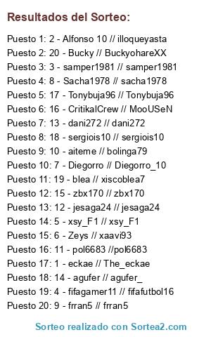 Lista de participantes: 1 - eckae // The_eckae, 2 - Alfonso 10 // illoqueyasta, 3 - samper1981 // samper1981, 4 - fifagamer11 // fifafutbol16, 5 - xsy_F1 // xsy_F1, 6 - Zeys // xaavi93, 7 - Diegorro // Diegorro_10, 8 - Sacha1978 // sacha1978, 9 - frran5 // frran5, 10 - aiteme // bolinga79, 11 - pol6683 //pol6683, 12 - jesaga24 // jesaga24, 13 - dani272 // dani272, 14 - agufer // agufer_, 15 - zbx170 // zbx170, 16 - CritikalCrew // MooUSeN, 17 - Tonybuja96 // Tonybuja96, 18 - sergiois10 // sergiois10, 19 - blea // xiscoblea7, 20 - Bucky // BuckyohareXX.