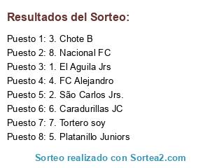 Lista de participantes: 1. El Aguila Jrs, 2. São Carlos Jrs., 3. Chote B, 4. FC Alejandro, 5. Platanillo Juniors, 6. Caradurillas JC, 7. Tortero soy, 8. Nacional FC.
