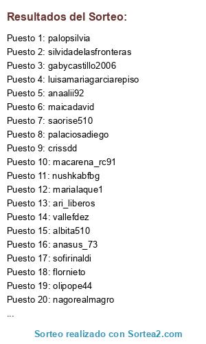 Lista de participantes: blanca_9898, nushkabfbg, palopsilvia, sofirinaldi, luisamariagarciarepiso, moniquita237, sure_1980, albita510, olakase070101, cousov, crissdd, lorenarodriguezrosa, macarena_rc91, palaciosadiego, marialaque1, olipope44, gabycastillo2006, sandra82fvn, anasus_73, flornieto, maicadavid, ari_liberos, anaalii92, nagorealmagro, silvidadelasfronteras, vallefdez, saorise510.