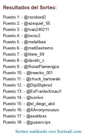 Lista de participantes: - @mati0extremo, - @treecko_001, - @titere_99, - @RonalFlamengos, - @axelitoxx, - @metalikaa, - @locoo2, - @chuck_bartowski, - @ExFrankoXmaui1, - @ezequiel_55, - @davidc_c, - @Ivan240211, - @DipiSlipknot, - @XAnonymouszx, - @rocoloxd2, - @guason-ips, - @luoriivo, - @el_diego_akd.