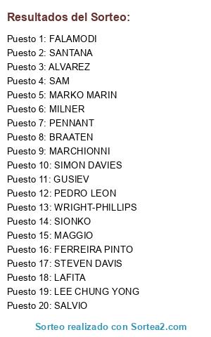 Lista de participantes: LEE CHUNG YONG, SIONKO, MARCHIONNI, SALVIO, PENNANT, SANTANA, MILNER, GUSIEV, PEDRO LEON, MAGGIO, MARKO MARIN, SIMON DAVIES, BRAATEN, STEVEN DAVIS, FERREIRA PINTO, WRIGHT-PHILLIPS, FALAMODI, ALVAREZ, SAM, LAFITA.