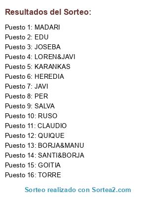 Lista de participantes: HEREDIA, SALVA, JAVI, PER, CLAUDIO, KARANKAS, MADARI, TORRE, SANTI&BORJA, BORJA&MANU, QUIQUE, JOSEBA, GOITIA, LOREN&JAVI, RUSO, EDU.