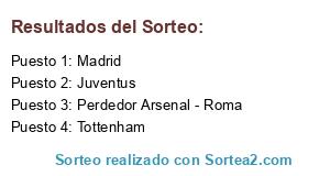 Lista de participantes: Tottenham, Juventus, Madrid, Perdedor Arsenal - Roma.