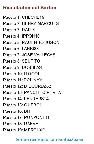Lista de participantes: DONBLAS, POLINYY, LANKI88, PANCHITO PEREA, HENRY MARQUES, BIT, IPPON10, SEUTITO, RAFAE, JOSE VALLECAS, PONPONETI, QUEROL, ITOGOL, LENDERS14, CHECHE19, MERCUXO, DAR-K, RAULINHO JUGON, DIEGORDZ82.
