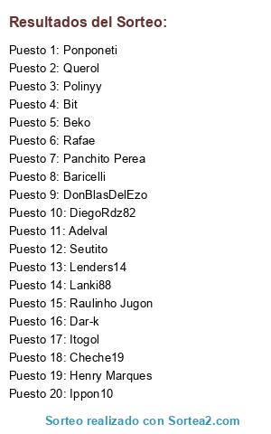 Lista de participantes: Panchito Perea, Ippon10, Rafae, DonBlasDelEzo, Cheche19, Lanki88, Itogol, Henry Marques, Querol, Adelval, Lenders14, Raulinho Jugon, Seutito, Beko, Ponponeti, Baricelli, DiegoRdz82, Bit, Dar-k, Polinyy.