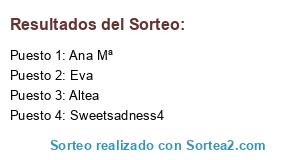 Lista de participantes: Laura.G, Ana Mª, kaedayla, Maria Carmen, Teresita Abc, Altea, Karolina, carmenr, Karmencitha, Beatriz, Eva, Sweetsadness4.