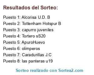Lista de participantes: olimperos, Caradurillas J.C, capurro juveniles, ApuroHuevo, las panteras u19, Alcorisa U.D. B, Tortero sS20, Tottenham Hotspur B.