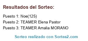 Lista de participantes: TEAMER Amelia Oreja Ramírez, TEAMER Nati Aler, TEAMER Mª Pilar Muñoz Casanellas, TEAMER Esther Sagasti Verano, TEAMER Rebeca muñoz gomez, TEAMER Lluïsa Vives, TEAMER Javier cherradi molina, TEAMER Gioconda ordosgoitti Fermin, TEAMER Sonia Esteban Domínguez, TEAMER Amalia MORANO, TEAMER rosalia lahoz ros, TEAMER Reyes Ruiz Barberá, TEAMER Inma García Trujillo, TEAMER Anna Torné Quer, TEAMER Debora De la peña, TEAMER Silvia Valencia González, TEAMER Vanesa Del Rio, TEAMER NURIA SUÁREZ GUARDIA, TEAMER Rosa Blanco Guerrero, TEAMER Merce Coll Serrahima, TEAMER Maria jesus muñoz castillero, TEAMER Lídia Jiménez Palomino, TEAMER Gema andres parada, TEAMER Chusi riveira castelo (Okupa RC), TEAMER Teresa PG, TEAMER Cristina Brutau Bras, TEAMER RAQUEL MARTÍNEZ ARIAS, TEAMER Meritxell Vilà Domingo, TEAMER BEATRIZ LA PARRA SUAREZ, TEAMER Gemma Garcia, TEAMER Manoli Abal Esnaola, TEAMER Raquel Franco Rodríguez, TEAMER Teresa Da-Riva, TEAMER Veronica Diaz Oreja, TEAMER Samantha brandariz paredes, TEAMER Elena Pastor, TEAMER Raquel López Castro, TEAMER Isa Carricondo, TEAMER Manuel Enciso Fernández, TEAMER Arantxa Leoz Sastre, TEAMER Víctor Aloras Verstoep, TEAMER Gemma Sanz Moreno, TEAMER Beatriz Valencia Gonzalez, TEAMER Marisa Bermejo Manso, TEAMER RUT VALDIVIA CANO, Vane del Río(5), María Luisa Bermejo(10), Debora de la Peña(20), Chusi Riveira(15), Mercè García(5), Noe(125), Pilar Muñoz(6), Albert C(20), Fran Bernal(10), Nuria Suárez(5), Camino(12), María Jesús Muñoz(10), Teresa PG(5), Ma Esnaola(5), M Socorro García(6), Mª Jesús Moreno Quintanilla(5), Lía(5), Raquel Alborada(4), Cristina Brutau(10), Belén Moreno(5), Oihana Serrano(5), Tere Muñoz(5), Silvia Valencia(5), Bea Palomares(10), Bea Valencia(5), Marta Tyrion(5), Alba Alonso(5), Rut Valdivia(20), Cristina Fernández(5), Gemma Sanz(5), Nati Aler(5), Eva de Porrata(10), Ester Iranzo(5), Esther Hernández(5), Lali Tarrago(10), Vicente(45), Laura Valverde(10).