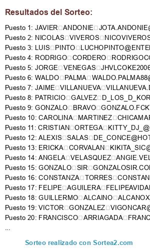- Puesto 75: CRISTIAN GONZALEZ CHIRISSS@GMAIL.COM 167145671 SANTIAGO