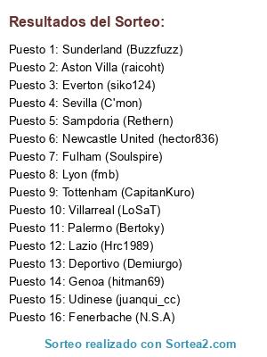 Lista de participantes: Deportivo (Demiurgo), Udinese (juanqui_cc), Everton (siko124), Sunderland (Buzzfuzz), Villarreal (LoSaT), Sevilla (C'mon), Lazio (Hrc1989), Palermo (Bertoky), Fenerbache (N.S.A), Fulham (Soulspire), Aston Villa (raicoht), Newcastle United (hector836), Sampdoria (Rethern), Genoa (hitman69), Lyon (fmb), Tottenham (CapitanKuro).