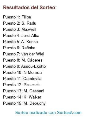 Lista de participantes: A. Konko, van der Wiel, Piszczek, M. Cassani, M. Cáceres, Rafinha, K. Walker, M. Debuchy, Assou-Ekotto, Jordi Alba, S. Radu, Capdevila, N Monreal, Maxwell, Filipe.