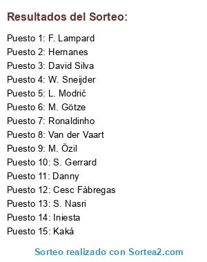 Lista de participantes: Iniesta, Cesc Fàbregas, David Silva, W. Sneijder, Van der Vaart, S. Gerrard, L. Modrić, M. Özil, S. Nasri, Kaká, Danny, F. Lampard, Hernanes, M. Götze, Ronaldinho.