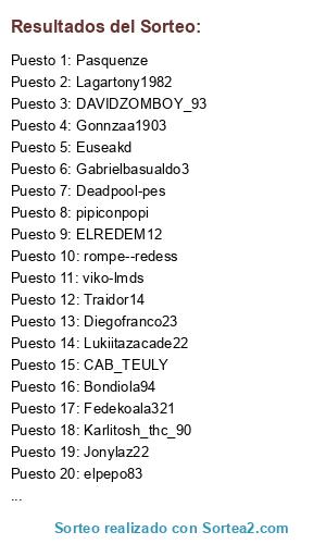Lista de participantes: Cristiands_, DAVIDZOMBOY_93, CAB_TEULY, Fedekoala321, viko-lmds, Gonnzaa1903, Lagartony1982, Ito762, Traidor14, Pasquenze, Francarp934, Euseakd, Gabrielbasualdo3, Lukiitazacade22, ELREDEM12, Diegofranco23, Narutoluis32, Katupequ, rompe--redess, Karlitosh_thc_90, Bondiola94, Jonylaz22, Deadpool-pes, elpepo83, pipiconpopi.