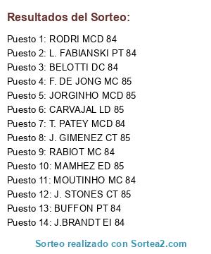 Lista de participantes: BELOTTI DC 84, RABIOT MC 84, MOUTINHO MC 84, MAMHEZ ED 85, F. DE JONG MC 85, CARVAJAL LD 85, J. GIMENEZ CT 85, JORGINHO MCD 85, J. STONES CT 85, BUFFON PT 84, T. PATEY MCD 84, J.BRANDT EI 84, RODRI MCD 84, L. FABIANSKI PT 84.
