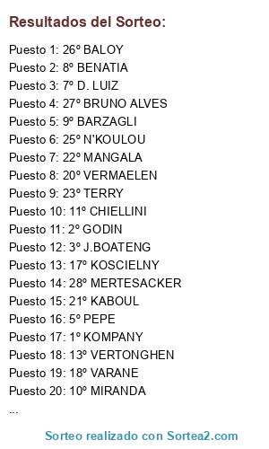Lista de participantes: 1º KOMPANY, 2º GODIN, 3º J.BOATENG, 4º HEINZE, 5º PEPE, 6º HUMMELS, 7º D. LUIZ, 8º BENATIA, 9º BARZAGLI, 10º MIRANDA, 11º CHIELLINI, 12º SAKHO, 13º VERTONGHEN, 14º DANTE, 15º K. TOURE, 16º PIQUE, 17º KOSCIELNY, 18º VARANE, 19º VIDIC, 20º VERMAELEN, 21º KABOUL, 22º MANGALA, 23º TERRY, 24º ALEX, 25º N'KOULOU, 26º BALOY, 27º BRUNO ALVES, 28º MERTESACKER.
