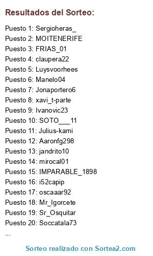 Lista de participantes: Aaronfg298, claupera22, Er_wakandu, FRIAS_01, i52capip, IMPARABLE_1898, Ivanovic23, jandrito10, Jonaportero6, Julius-kami, Luysvoorhees, Manelo04, mirocal01, MOITENERIFE, Mr_Igorcete, oscaaar92, Sergioheras_, Soccatala73, SOTO___11, Sr_Osquitar, xavi_t-parte.