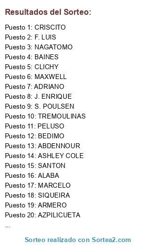 Lista de participantes: F. LUIS, ALABA, J. ALBA, ELDERSON, BAINES, TREMOULINAS, FABIO, KOLAROV, MARCELO, SIQUEIRA, EVRA, F. COENTRAO, ADRIANO, J. ENRIQUE, AZPILICUETA, K. GIBBS, MAXWELL, ARMERO, ASHLEY COLE, NAGATOMO, CLICHY, S. POULSEN, BEDIMO, PELUSO, ABDENNOUR, SANTON, CRISCITO, BABANCO.