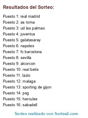 Lista de participantes: alcorcon, as roma, sabadell, fc barcelona, galatasaray, hercules, juventus, malaga, lazio, real betis, real madrid, sevilla, napoles, sporting de gijon, psg, ud las palmas.