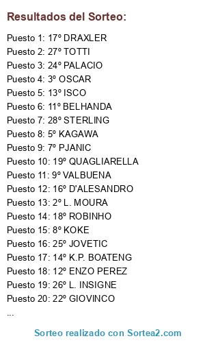 Lista de participantes: 1º KROOS, 2º L. MOURA, 3º OSCAR, 4º WILLIAN, 5º KAGAWA, 6º RAKITIC, 7º PJANIC, 8º KOKE, 9º VALBUENA, 10º NASRI, 11º BELHANDA, 12º ENZO PEREZ, 13º ISCO, 14º K.P. BOATENG, 15º A. HERRERA, 16º D'ALESANDRO, 17º DRAXLER, 18º ROBINHO, 19º QUAGLIARELLA, 20º RECOBA, 21º BIABIANY, 22º GIOVINCO, 23º EL SHAARAWY, 24º PALACIO, 25º JOVETIC, 26º L. INSIGNE, 27º TOTTI, 28º STERLING.