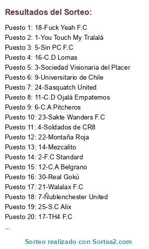 Lista de participantes: 1-You Touch My Tralalá, 2-F.C Standard, 3-Sociedad Visionaria del Placer, 4-Soldados de CR8, 5-Sin PC F.C, 6-C.A Pitcheros, 7-Ñublenchester United, 8-Red Saw Machine, 9-Universitario de Chile, 10-S.S.C La Franja, 11-C.D Ojalá Empatemos, 12-C.A Belgrano, 13-Albadictos, 14-Mezcalito, 15-Killer Lions, 16-C.D Lomas, 17-TH4 F.C, 18-Fuck Yeah F.C, 20-Bvlgari, 21-Walalax F.C, 22-Montaña Roja, 23-Sakte Wanders F.C, 24-Sasquatch United, 25-S.C Alix, 27-Galatic F.C, 28-Estrella Azul, 29-Troyans F.C, 30-Real Gokú.