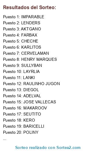 Lista de participantes: CHECHE, BARICELLI, LENDERS, RAULINHO JUGON, POLINYY, ADELVAL, HENRY MARQUES, LANKI, ITOGOL, KARLITOS, DIEGOL, DAR-K, RAFAE, FABIETE, SULLYBAN, BIT, SEUTITO, AKTGANO, JOSE VALLECAS, IMPARABLE, MAKAROOV, VLADI, EL MERCU, CERVELAMAN, LAYRLIA, MOITENERIFE.